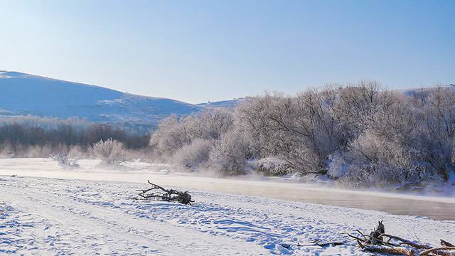 不去东北,在额尔古纳也可以看雾凇,早起去唯一一个冬泳的地方,湖面冒着热气腾腾的白烟,湖岸一遍雾凇挂满树枝,一遍白茫茫的雪地,远处是额尔古纳特色房屋。