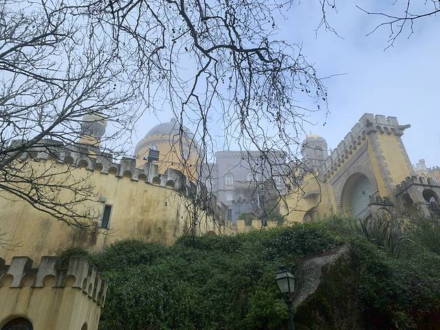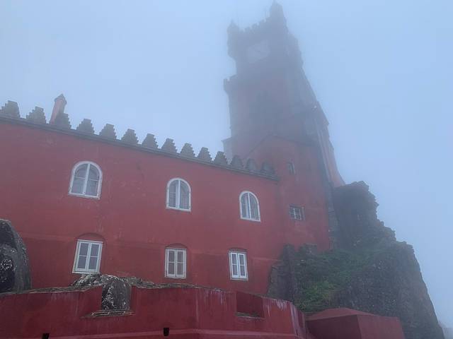 我们去的时候天气不太好,整座城堡笼罩在一片大雾中,很朦胧,有一种神秘的感觉。实际上阳光下的佩纳色彩艳丽,粉红色、红色和黄色的墙面和如发射火箭般的城堡顶层塔楼,使它看上去像一座乐园式的城堡。