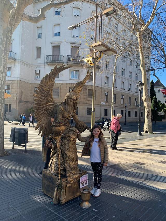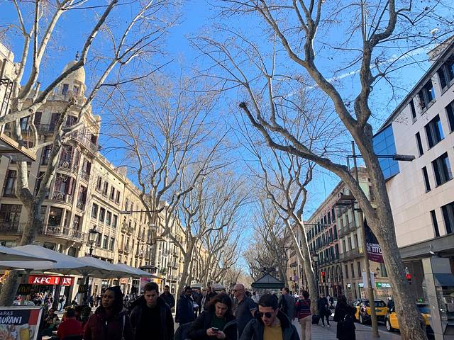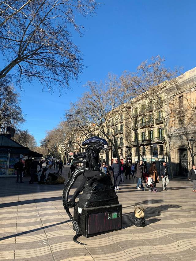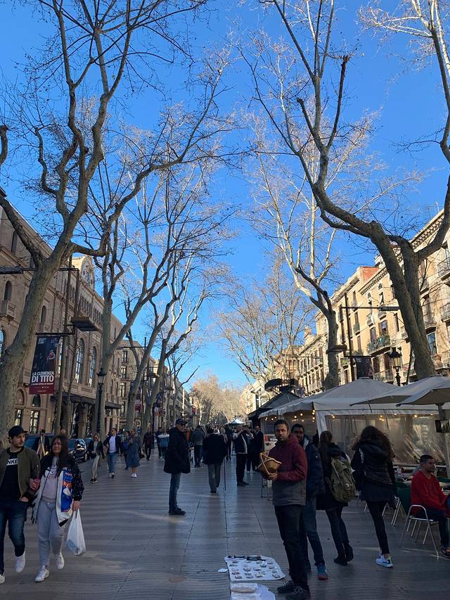 兰布拉大街是巴塞罗那市所建的第一条宽敞的大街,从加泰罗尼亚广场向下一直延伸到巴塞罗那旧港,一共有1800多米长,因为各路流浪艺人在这里进行各种游艺表演,沿街林立着五花八门的“真人雕塑”,所以又称之为“流浪者大街”。