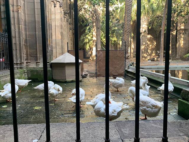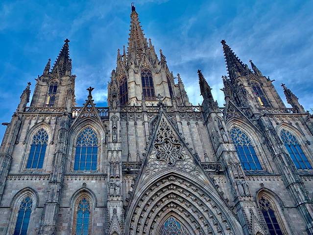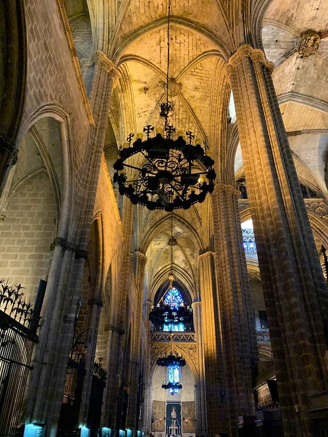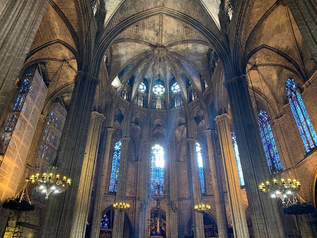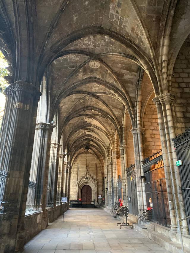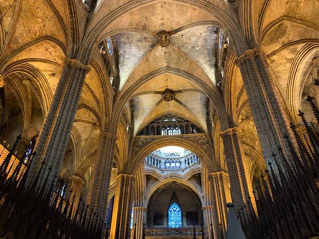 大主教堂始建于巴塞罗那最鼎盛时期的13—15世纪,从开始修建到完工共耗费了150年的时间,大教堂外观朴素,只用垂直扶墙装饰,教堂各部分呈现出不同的建筑风格,主体以哥特式风格为主。巴塞罗那大教堂相比圣家堂而言,少了嘈杂多了宁静,散发出浓浓的宗教味道。