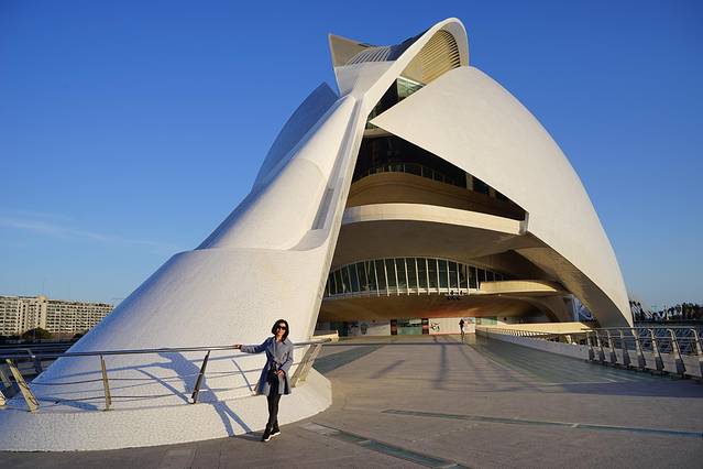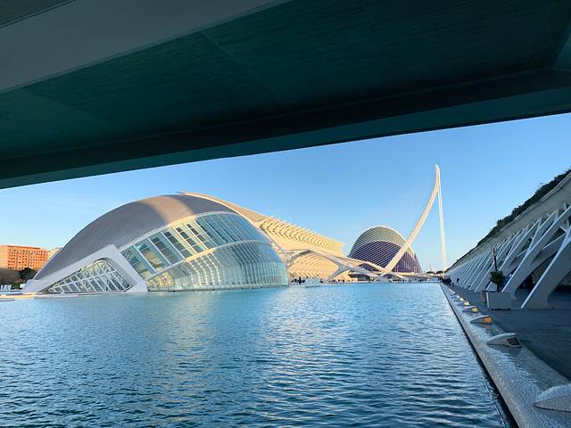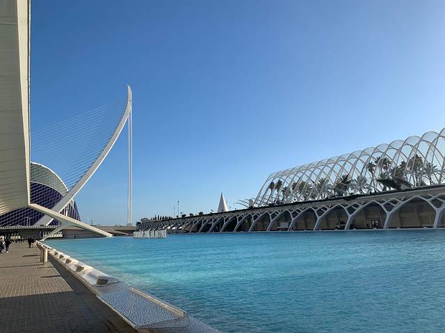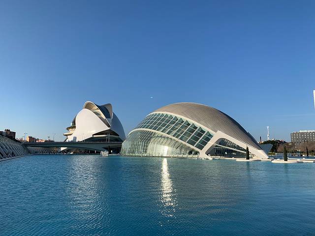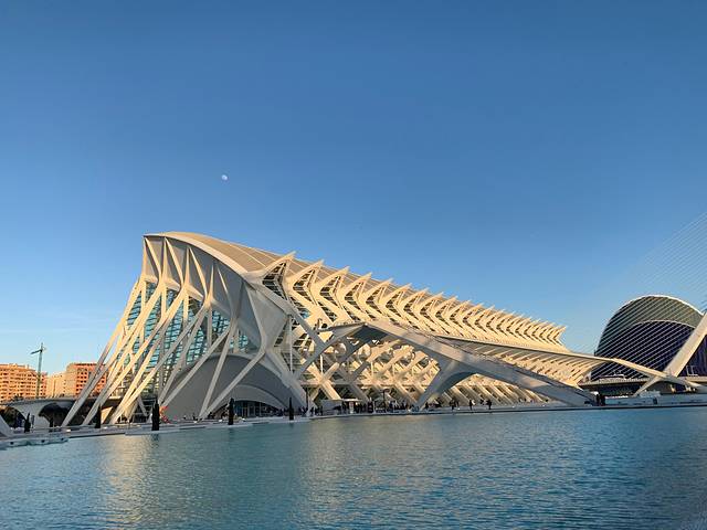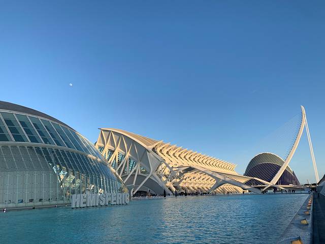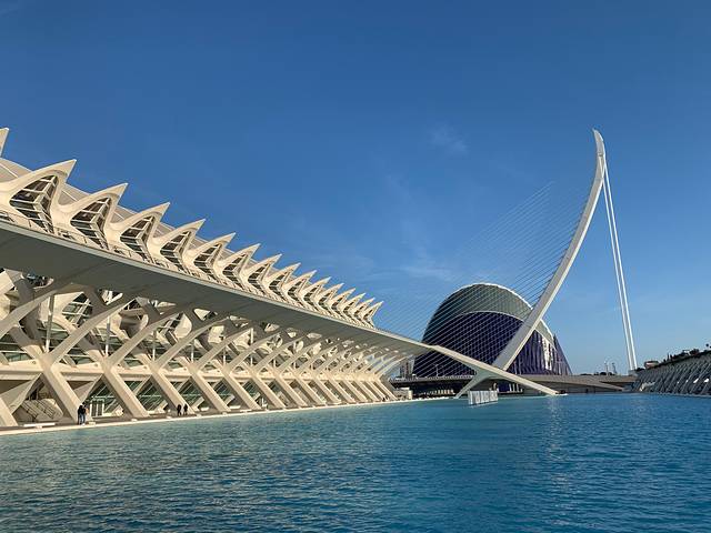 在圣巴巴拉城堡的咖啡馆用完简餐,我们开车往瓦伦西亚( valencia)走,从阿利坎特自驾到瓦伦西亚185公里,大概下午4:00到达瓦伦西亚,因为时间还早我们就直奔瓦伦西亚的艺术科学城。从下午一直呆到夜幕降临,看到了阳光下的艺术科学城,也看到美轮美奂的夜景,这是一组充满视觉冲击力和想象力的现代建筑。