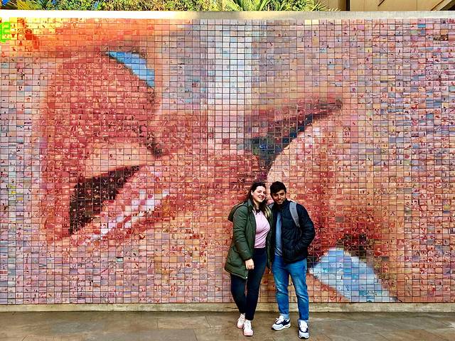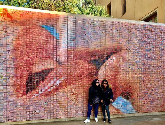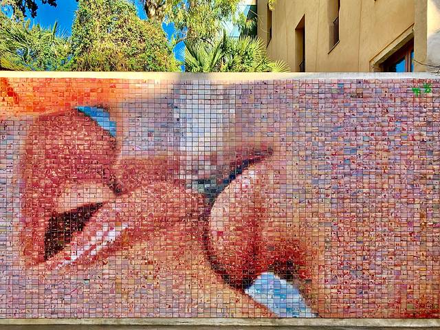 这面马赛克墙很有来头,仔细一看全是用红粉色系的不同照片组成的,远看整面墙是一对正在接吻的人。这面墙是为了纪念1714年的巴塞罗那战役而建,艺术家向市民征集了5000张照片,拼成了这堵墙。
