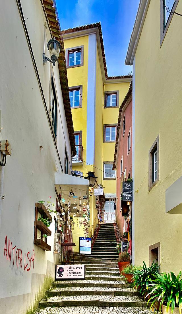 四通八达的石阶小路布满了辛特拉小镇,无论里斯本还是辛特拉,地面都是铺的马赛克式的碎石路,感觉这种小石路的铺设是个手艺活,很多道路还拼成各种图案和花纹,很有味道,而且下雨天踩在小石块上根本不担心溅水。