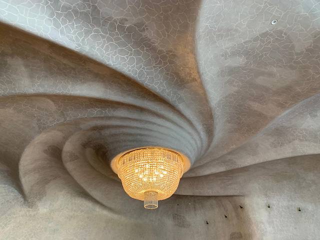 房间顶部是巨大的螺旋造型,像大海的漩涡一样,漩涡中心是海葵样的顶灯。