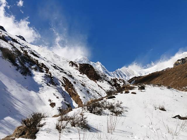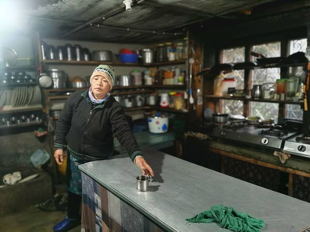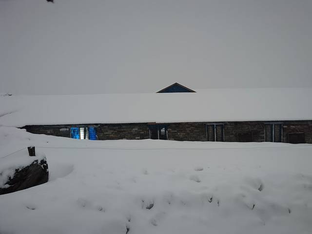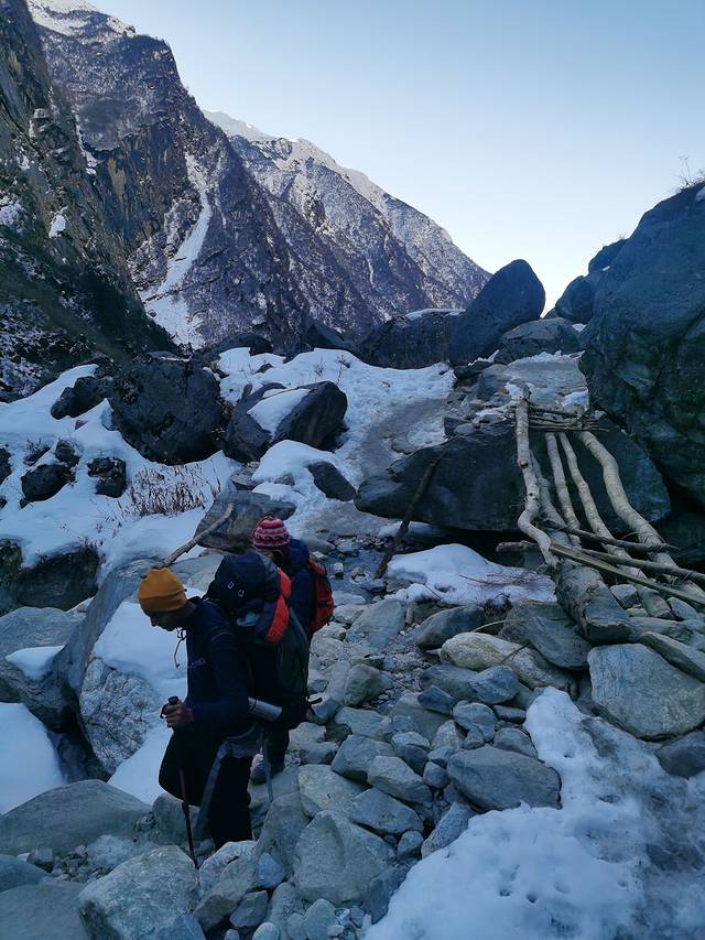 这天共负重行走七个半小时,肩膀硬生生的疼,还不住地痒。脚下走的是一些根本不能称其为路的路:帘帘飞瀑是路,杂草落叶是路,石块泥土是路,潺潺流水是路,积雪寒冰是路,盘根错节也是路。越往山上走条件越艰苦,晚上入住在喜马拉雅,热水收费,洗澡收费,而且还会限制时间,充电收费,取暖收费,谁掏钱就把燃气炉放在谁的脚下,这下衣服鞋子也没有办法烤干了,我战战兢兢地洗了个热水澡,暖和了起来。向导推荐了披萨,还让我们喝了一些御寒的酒,不到九点,餐厅就关灯了,估计是怕浪费电吧,客人们只好各自回房,晩上的房间像冰窖一样冷,我贴上了暖贴,钻进了睡袋,又搭了两床被子方能入睡。早上起来冷极了,实在不忍在室外冰冷的水龙头下洗漱,就这样不刷牙不洗脸吃了早餐再次上路!