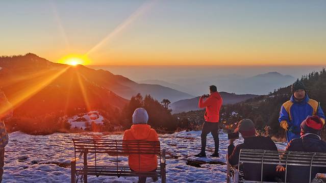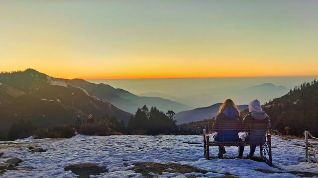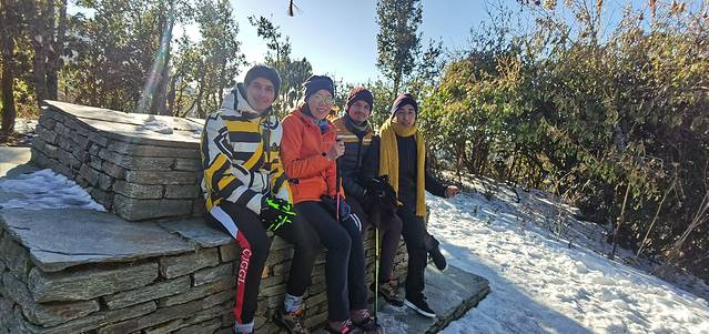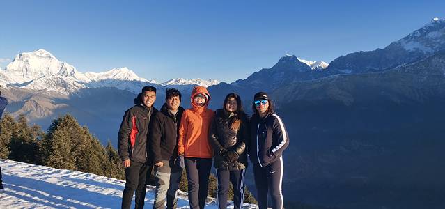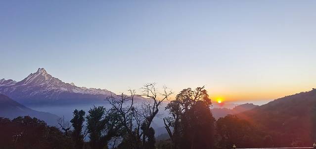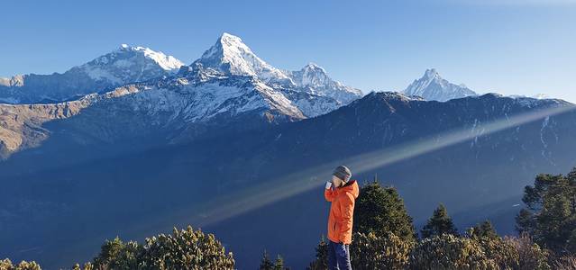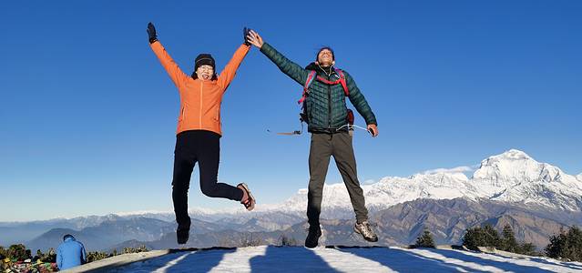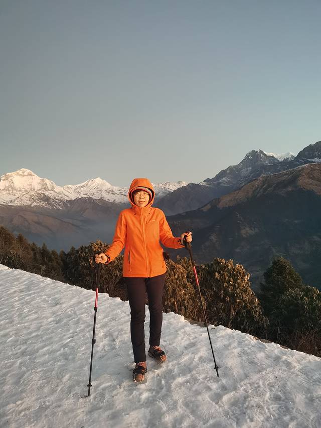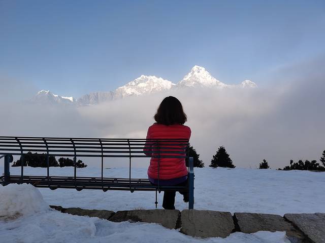 1月12日,重走布恩山,只为日出而来。早上四点半,穿上厚厚的衣服,戴上头灯,套好防滑链,手持登山杖,摸着黑深一脚浅一脚地和世界各地的徒步爱好者们一起向布恩山顶爬去!在这里,可以欣赏到喜马拉雅西段最美的日出,鱼尾峰,安娜普尔娜群峰,道拉吉里峰等一字排开!晨曦中,人们异常安静,当第一缕金光撒向雪山时,山顶沸腾了起来,拥抱,欢呼,歌唱,似乎没有哪一个动作,哪一种声音能表达得了此时的激动和兴奋!拍照当然是重头戏了,然而我也不忘深情地敬雪山一杯红茶,迎着初升的朝阳,对望皑皑的雪山,脚踏向往的土地,这杯红茶里满含我对生活的希望!
