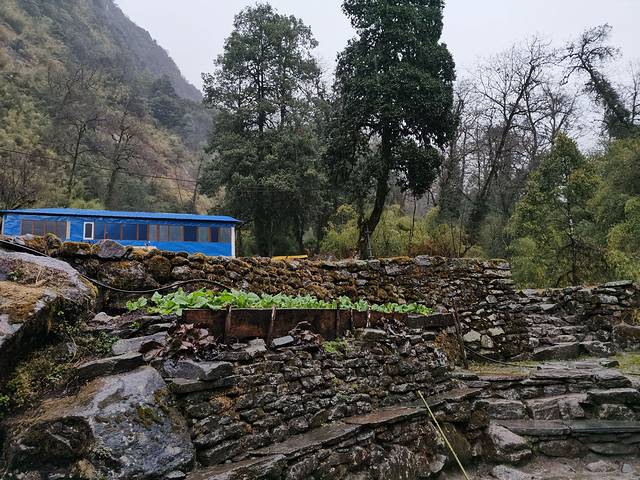 暴风雪都经历过了,这点雨算什么,继续出发!山下是雨,海拔较高的山上仍然是雪,所以看到的景致也特别了起来,远山戴上了白帽,披上了薄薄的白纱,真是"青山原不老,为雪白头"呀!一切柔美了起来,心也变得柔软了,走走停停,拍拍摄摄,虽然地面依然泥泞,衣服依然被雨水浸透,但这些都挡不住拍摄的兴趣!雾气升腾着,水墨画使人如入仙境,飘飘缈缈,脚步也轻快了许多!两三个小时以后,我们就回到了希努瓦,也就是我的向导等我的地方,餐厅小哥见我到来,立刻叽叽喳喳着去叫向导,他一瘸一拐地过来拥抱了我,我明白他想要表达的意思是终于回来了!也就是在这里,我和给我们开路的向导再一次相遇了,后来听他说,在布恩山住宿时就在同一家酒店,他注意到我是一个人,只不过没有打招呼,可是我完全没有印象,不停翻看前面的照片才发现了他。他给我看了昨天暴风雪中的照片和视频,并且互加了微信!我们正式认识了,友谊也就此开始了!休息过后,姐姐因为今天必须赶回博卡拉,而我则没有什么行程,所以在此分开,他们先行一步!我和腿脚不便的向导慢慢悠悠地在后面如散步般遛遛达达,雨一会停一会儿下,我们走过了进山检查站,这也意味着我们即将离开安娜普尔纳,向博卡拉方向走去,离通车的公路近了,按理说路应该更好走,但完全不是这样,雪滑转变成了雨滑,稍不留神就会摔坐地上,我几次怀疑向导带错了路,但也只好由着他去了!好不容易走上了大路,可以痛痛快快地走会了,砰砰几声,山上有石头滚落下来,雨后泥土松滑,这是常有的事,可我怎么有种出了虎穴又入狼窝的感觉!