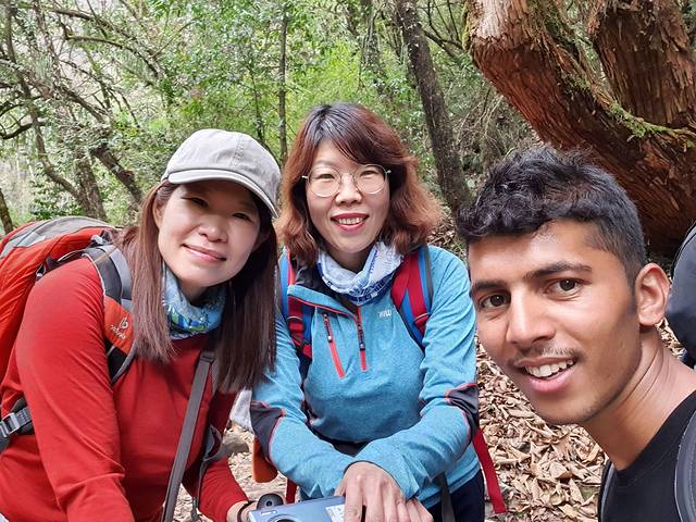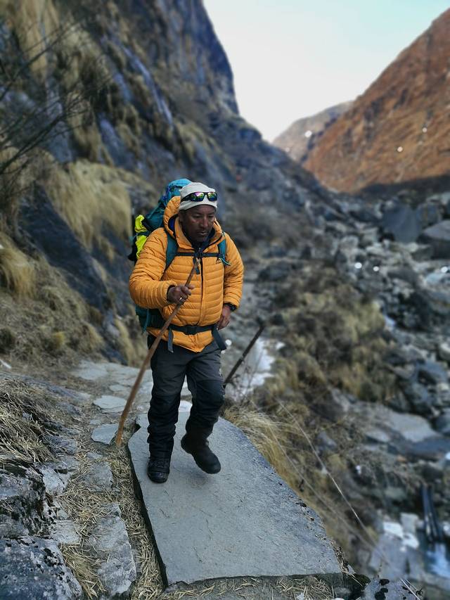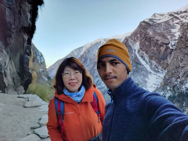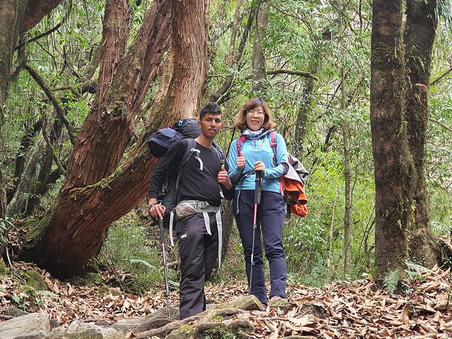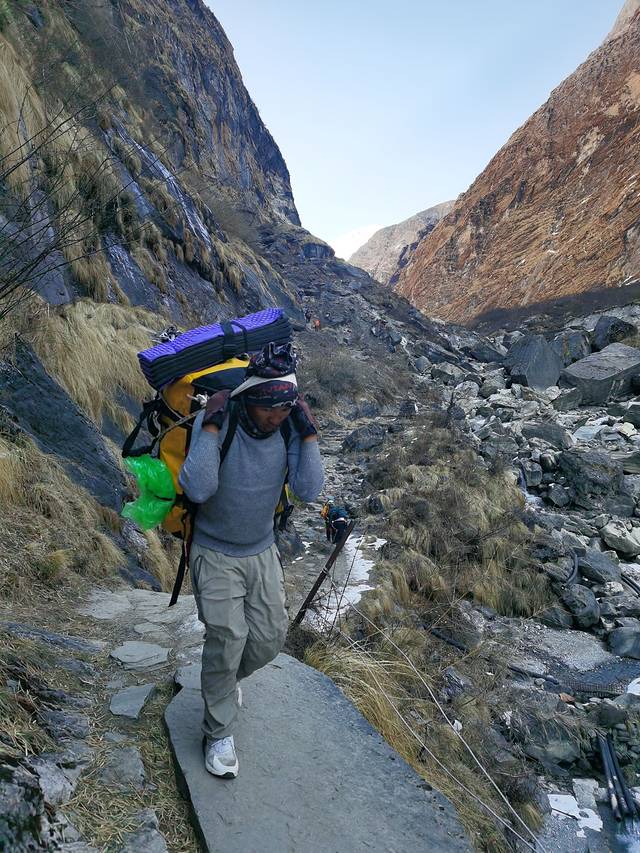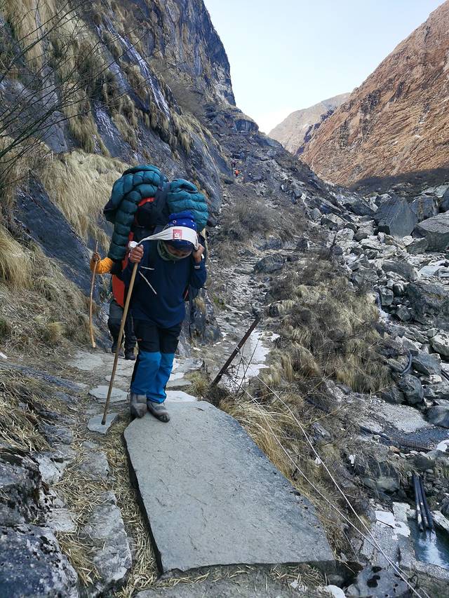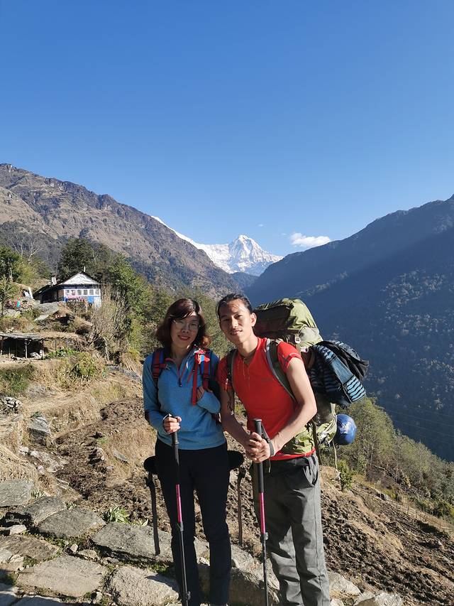 1月14日,早上起床后,向导的脚肿得像面包似的,看来根本没有办法随我继续前行了,于是我征得了马来西亚华裔姐姐的同意,和她一起走!我拒绝了再帮我雇一个背夫的请求,把上山必备的物品塞在了一个登山包里,背在肩上如块沉重的大石头,这或许是对自我的一种挑战吧!就这样负重上路了!这位向导不仅人长得帅,而且有自己的徒步公司,平时不亲自带客人上山,这次主要是因为姐姐已经第三次来徒步了,他们已经是关系很好的老朋友了,所以才肯亲自前往。他从十五岁就做向导,一直到今年大约有十多年了,他对路线非常熟悉,不停地向我们报备还有多长时间就上坡了,再过几小时就看到河了,需要多久才能到休息站,而且精确到分,基本没有错过!哪家饭店的奶茶好喝,哪家餐厅的披萨好吃,这家的自酿酒应该尝一下,那家的辛拉面必须吃一次,总之一句话,听他的选择准没错!他话不是特别多,但是给人一种稳重踏实的感觉,和我的向导是性格截然不同的两类人,虽然我不是他的客人,但一路对我的照顾也非常周到!