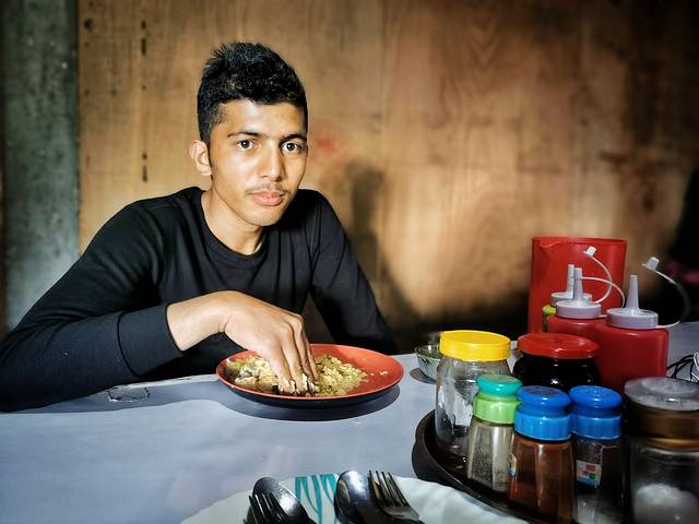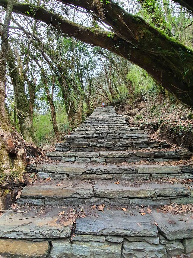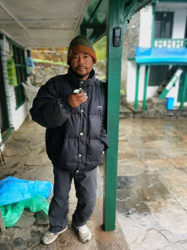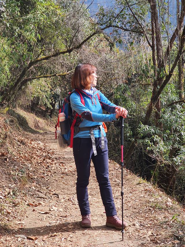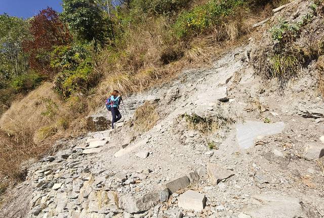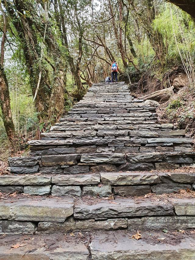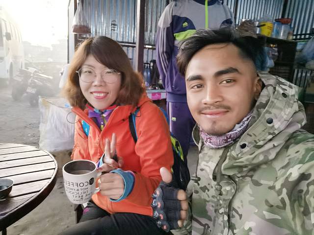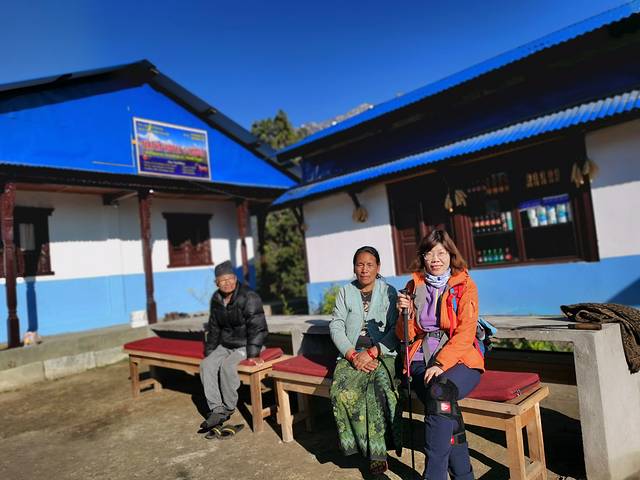 1月14日,早上起床后,向导的脚肿得像面包似的,看来根本没有办法随我继续前行了,于是我征得了马来西亚华裔姐姐的同意,和她一起走!我拒绝了再帮我雇一个背夫的请求,把上山必备的物品塞在了一个登山包里,背在肩上如块沉重的大石头,这或许是对自我的一种挑战吧!就这样负重上路了!这位向导不仅人长得帅,而且有自己的徒步公司,平时不亲自带客人上山,这次主要是因为姐姐已经第三次来徒步了,他们已经是关系很好的老朋友了,所以才肯亲自前往。他从十五岁就做向导,一直到今年大约有十多年了,他对路线非常熟悉,不停地向我们报备还有多长时间就上坡了,再过几小时就看到河了,需要多久才能到休息站,而且精确到分,基本没有错过!哪家饭店的奶茶好喝,哪家餐厅的披萨好吃,这家的自酿酒应该尝一下,那家的辛拉面必须吃一次,总之一句话,听他的选择准没错!他话不是特别多,但是给人一种稳重踏实的感觉,和我的向导是性格截然不同的两类人,虽然我不是他的客人,但一路对我的照顾也非常周到!