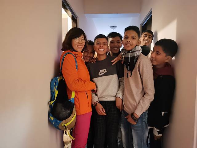 仍然入住上次的酒店,在熟悉的的陕西面馆吃完中餐刚回酒店,就遇到了刚刚入住的好多学生,男孩子们一个个非常帅气,也很大方,他们热情地和我招呼,主动地邀我合影完后,又让我和他们在院子里的篝火前载歌载舞!好不热闹!