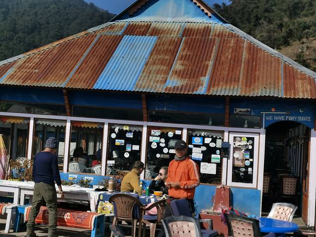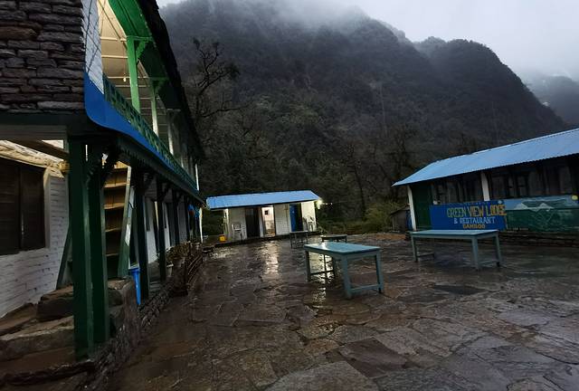 日出是没有希望看到了,客栈的其他客人也还没有起床,我们赶紧吃完早餐想早一些出发,向导告之我们今天的行程会很辛苦,全副武装一番之后,又把买的雨衣套在了最外面。其实出发前犹犹豫豫没有带雨衣,在博卡拉想到了暑假在稻城被淋成落汤鸡的经历,浑身顿时感觉都会冷得直打哆嗦,于是买了件厚厚的雨衣,没想到今天一整天都全靠它了!