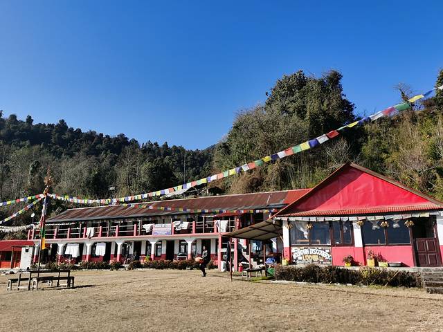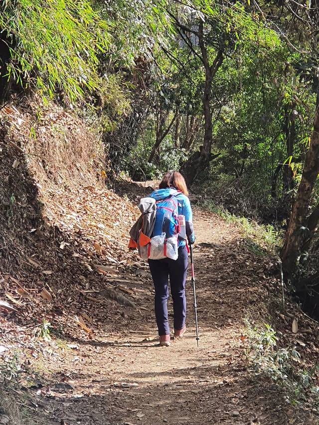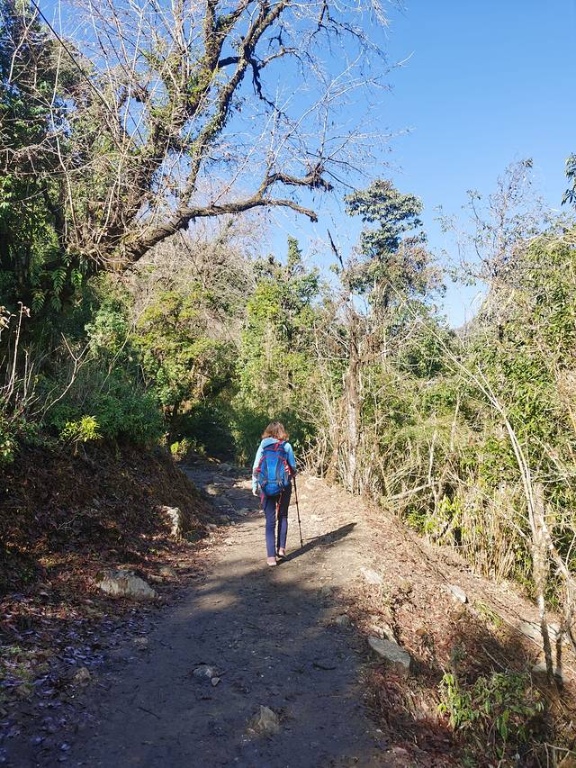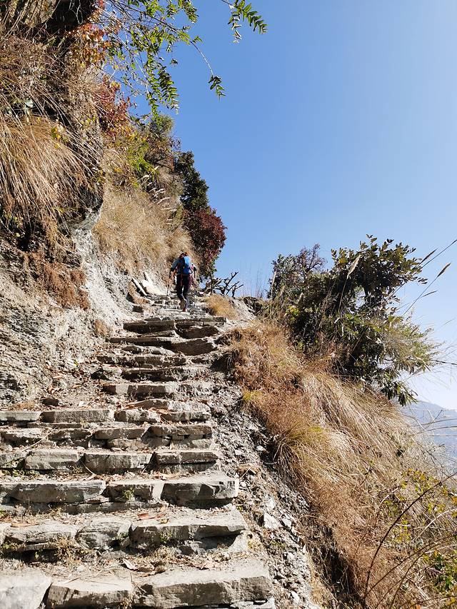 检查站过后,徒步正式开始了,由于海拔较低,所以天气很热,只穿单衣即可,特别享受一步一个脚印踏踏实实向前走的感觉,我在用脚丈量土地,我在用心感受生活,冬天依然能开得很旺的花,被游人们踩出来的山路,还有那如蓝天般湛蓝的屋顶,仿佛都是生命的象征,能给予你我无限的力量。时而快速前行,时而静坐沉思,眺望远山,灵魂也被带离过去。下山时,背着很重的背包也能如孩子般蹦哒,上山时,虽气喘吁吁大汗淋漓我也不忘驻足观赏!