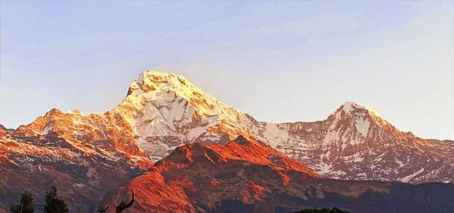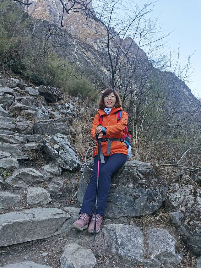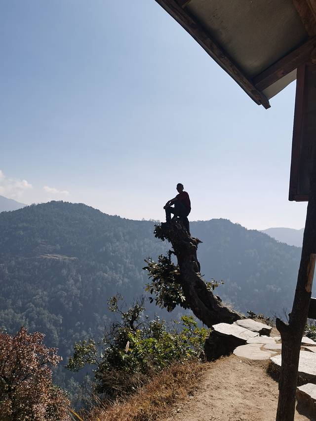 瞬间,他就坐在了树杈上!在这里遇到了一位日本的女孩子,19岁,因为感冒有些高反,不停地喘着粗气,原本计划去ABC的,现在只能下山了!旅行就是有如此多的意外!