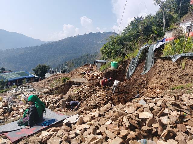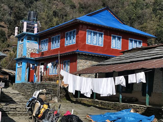 昨天晚上入住的好多游客下山后返回博卡拉,我们继续向前到安纳普尔纳!今天路过的村庄不是很集中,山势很陡,房子之间相隔甚远,相对于昨天的峡谷,今天来到了向阳面,喜马拉雅的南坡阳光明媚,雨水充沛,植被茂密,很适合人类居住,这个叫Ghomrong的村庄是我此行最喜爱的村子了。这个村庄较大,生活气息浓厚,正在晒麦穗的妇女,盖房子的壮年男子,院子里磨刀的老人,放牛归来的少年,每个人的脸上都洋溢着富足的笑容,如阳光般温暖。运送货物的马队,叮叮当当如乐曲般悠扬的马铃声,和着山谷里潺潺的溪流声,映衬着山坡上绿油油的梯田,就连那一级级的台阶,一块块的青石板都在阳光的沐浴下散发着生命的气息!我不忍离去,在这里久久凝望,或是享受,亦是思考!再次起身时,我那如小兔般活蹦乱跳的向导一下子踩空了台阶,右脚扭伤了,又是喷药,又是贴药膏,但伤得很重,他强忍疼痛,但仍面带笑容,反而安慰我不要担心!过吊桥,爬石级,攀至山顶,来到了今天晚上要入住的村庄希努瓦,对面就是Ghomrong,暮色降临,对面的山坡上可见点点灯火,如繁星闪烁,每一座房子里,每一盏灯火下,都有着一个希望在燃烧!