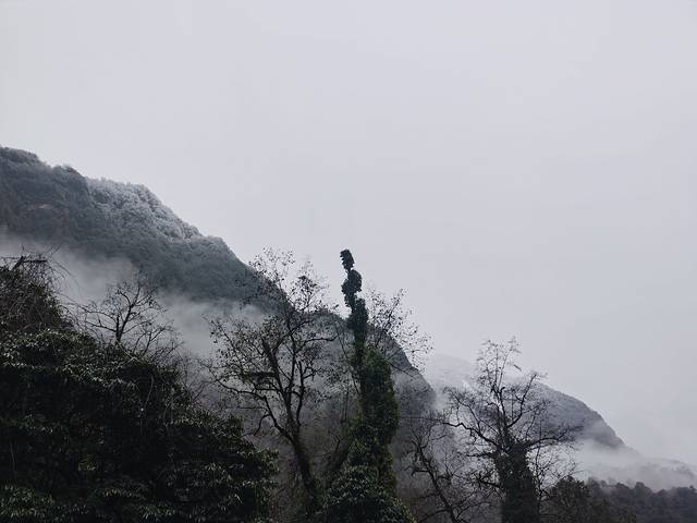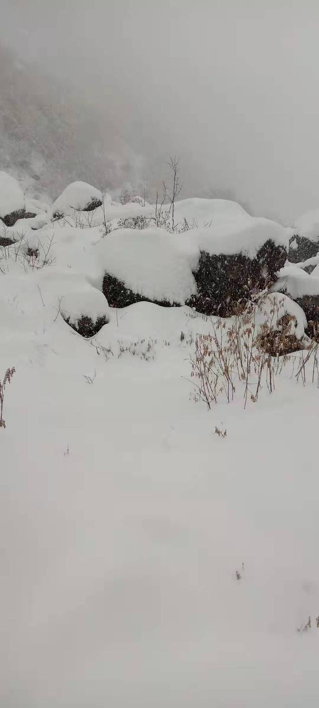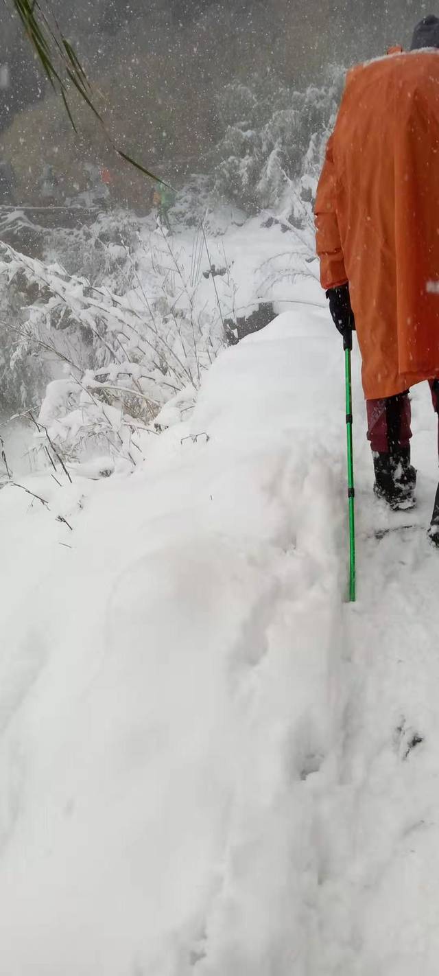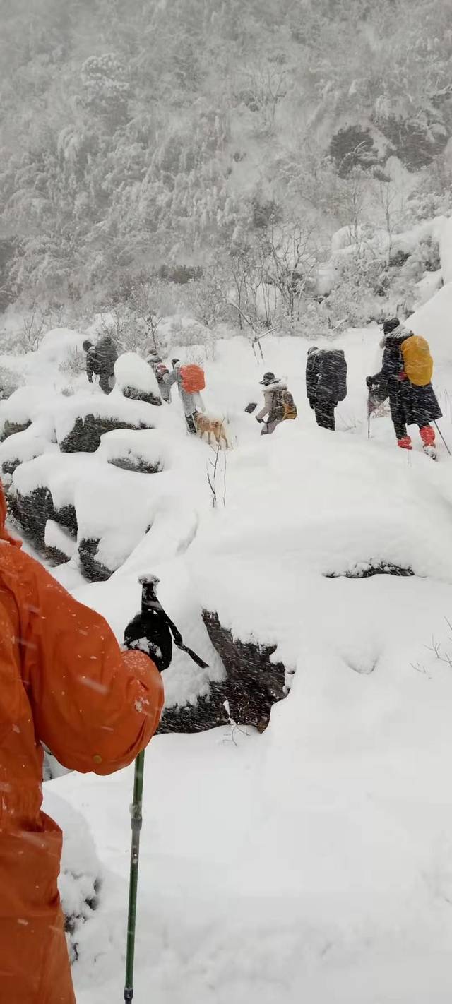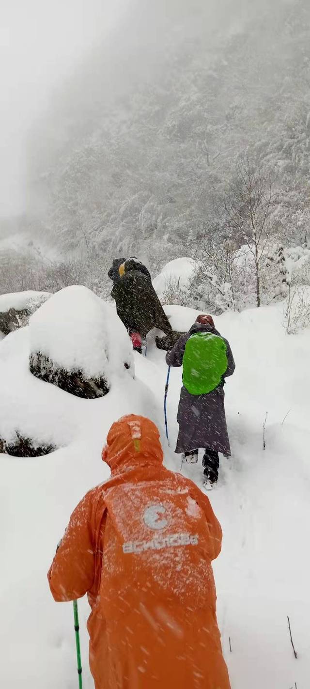 看着这漫天飞舞的雪,我真不想上路,因为昨天上山时路上已满是冰雪,周围白茫茫一片,所谓路,也只是游客们踩出来的脚印而已!一夜的大雪过后,屋外的台阶变成了陡坡,百十级的台阶下面一片平整,连一丝滑过的印迹都没有,难道我们真的要前行吗?向导好像很有信心,不断催促我们,就这样,开始了今天的惊险之旅!