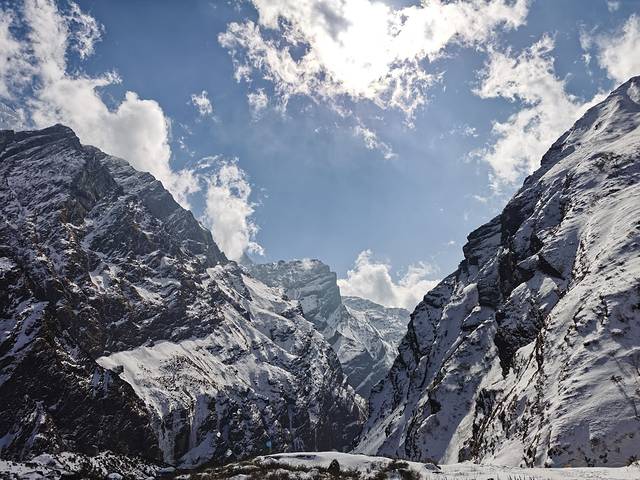 1月15日,今天行走八小时,终于到达了心之向往的安纳普尔纳大本 营, 这也是ABC途步路线的终点,安纳普尔纳(Annapurana)地区位于尼泊尔北部的喜马拉雅山中段,Annapurana在当地语中有粮食供给者或收成之神的意思。安纳普尔纳是目前全世界唯一的一条8000米的雪山徒步线路,所以吸引了众多世界各地的游客。从最初的海拔800米一步步地上升到海拔4130米的ABC,海拔落差巨大,一路上的植被地貌种类非常丰富,从平原的阔叶森林到高海拔的高山草甸,再到寸草不生的哑口,美妙绝伦的雪山,几乎将尼泊尔的各种山地走了个遍。从窄窄的狭谷走到了非常宽阔的地带,景致也发生了很大的变化,山势险峻挺拔,如大自然的鬼斧神工雕刻出来一般,是那样的雄伟壮观,大气磅礴。渺小的人类行走于这样的天地之间,又怎敢轻言征服呢!高海拔地区的天气瞬息万变,刚刚太阳还露着脸,一眨眼的功夫就大雾弥漫,遮住了那密集排列的十座海拔7000米以上雪峰,估计再没有一个地方能像ABC大本营这样被如此多的高山雪峰所环绕!我才刚目睹了他们的真容,就如此快地蒙上了面纱,风吹来吹去,雪峰也随势若隐若现,这或许也是吸引大批徒步爱好者前来一睹芳容的一个理由吧!