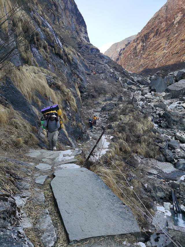 被开拓出来的路生命之路,从ABC下到MBC时,地势开阔,没有茂密的植被,都是一些高海拔的高山草甸,在这里,一般情况是不会有雪崩发生的,但这样的地势,被暴风雪卷走是极有可能的