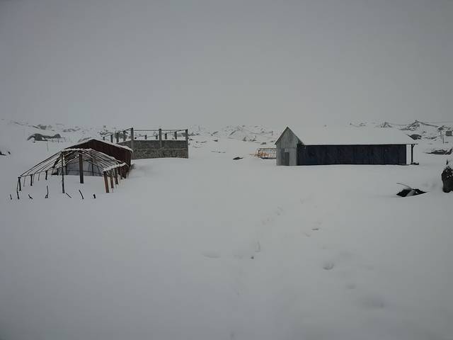 1月16日,早上四点多就起床了,一直盼望着去看日出,按捺不住激动和兴奋,感觉黑夜是如此漫长难挨,五点半推开房门,星星在夜幕下闪烁着眼睛,簌簌之声传入耳际,雪粒飘飘洒洒,如随风扬起的银屑,反射出亮白的光芒,原来是下雪了。再一看,雪已经积得很厚了,本来就已经被白雪包裹的大本营此时感觉如在茧中一般,只能望见近处客栈那半截灰色的墙,似乎它的存在就是为了不让我们混淆天和地的界线吧!
