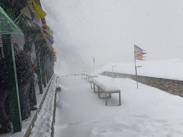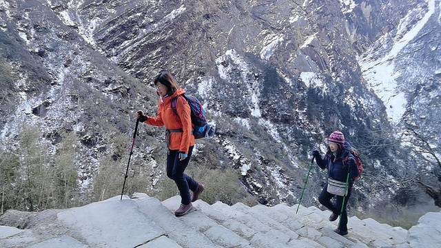 放下背包,脱掉雨衣,大家都静静地坐在长椅上开始了漫长的等待,和昨天途经时在院子里暖阳下吃午餐的情形相比,沉闷了许多,大家或许还没有从暴风雪路途的惊险中回过神来吧!看看今日,再想想昨天,时间此时仍有情,但大自然是无情的,我们看到的,听到的,享受到盛宴,哪一样不依托于它的青睐,哪一样不是它的恩赐。它怒号时瞬间可以摧毁我们的一切,我们可以不断地利用它,怀着感激敬仰之情与它和谐共处,怎可处处想着征服于它呢?这是我们人类的贪婪和自不量力!雪下的更大了,房顶似乎都要被压塌了,有人赶紧爬上房顶把雪倾倒而下,因为2019年2月的大雪就使得大本营的房子全部倒塌了。不一会儿功夫,陆续有人从山下上来了,这下房间里热闹了起来,有的在点热乎乎的红茶,有的则开始拧衣服上的水,再看这位年轻老外,吹着口哨拿起刚拧完水的袜子还不忘闻一闻,然后才放回背包,引起我们一阵哄笑,这笑声打破了刚才紧张的气氛。人越集越多,餐厅已经挤不下了,有的人回到了房间。虽然不到午餐时间,但还是都点餐进食已保存体力,我们的向导有先见之明,下来后就给我点了辣乎乎的辛拉面。午餐后,向导叫我们开始穿戴,难道又要出发了吗?“有人从下面上来,说明我们可以下去,路还可以走。”姐姐翻译说。看到是和先前的一行人一起上路,我也不再犹豫,现在回想,真庆幸当时决定和大家一起下山,要不然第二天……真是不敢想象下去。大家仍然一字排开,我们先是走在中间,但是姐姐步伐太慢,慢慢就掉到了最后,我催促说:“咱们还是快一些吧,不要掉队,这样很危险。”但是向导说拉开一些距离比较好。一路上我的手机从来没有闲暇拿出来看一眼,眼镜后来也索性放在了口袋里,因为戴着也是模糊一片,我的冰爪也不太好用了,总会结上大大的冰块掉不下来,所以也摔倒了好多次!每次倒入雪坑,都会陷得很深,想要爬起来,都异常艰难,要用尽全身的力气,第二天,才发现我的左手肿了,很疼,但想不起来是在何时何地伤着的,我想应该是摔倒爬起时支撑地面过于用力的缘故吧。更是无心欣赏两旁的风景,只担心会被落在后面。偶尔还会遇见上山的人,我真为他们捏把汗!行至一处右边是陡峭悬崖的山腰时,突然,一阵风吹过,只听哗哗声传来,山上的积雪瞬间卷了过来,顿时,我的全身像被一个白色的大麻袋裏住似的,向导大喊向后跑,我立刻调转身子,向后跑了几步,可是这样厚的雪,这样大的风,哪里是能跑得起来的,风雪肆意卷过的速度太快了,我放弃了,无力地站在原处,因为我深知,我跑不过风,由它去吧!向导立刻抱住了我俩,此时此刻头脑一片空白,唯有任命了。还好没有一分钟风就停了,雪也不再卷了。刚放下的心又提起来了,既得小心翼翼,又得快步疾行。既想慢一些走,辨别是否有雪崩袭来,又想快一些走,好快速通过这危险地带,心里满是矛盾!就这样走了好久好久,当到达一处休息点时,方得知刚才向导抱住我们时,是遇到了雪崩,走在我们前面的队友就不幸遇上了,他们经过时,雪正好塌了下来,重重地压在了他们的身上,所幸都只是受了一些轻伤,因为这次的雪崩时间较短。听他们议论,去年的2月份这里也发生了雪崩,有好多人失联,最后有一位荷兰游客永远留在了这里!听完这样的消息,内心纷乱复杂,感谢上天对我们的眷顾!喝杯奶茶,暖暖身子,压压惊吓,默默无语继续赶路,随着海拔的降低,雪也慢慢地小了,当向导告诉我们到达了安全地带时,焦躁不安的心才慢慢地平静了,可是距离今晚要入住的地方还有很远,加紧步伐赶路吧。茂密的丛林中天色很快暗了下来,戴上头灯,打着手电筒,依然很昏暗,已经走到了麻木,只剩下两条腿在机械地交替着,姐姐崩溃了,冲着向导大声吼:“不是说很快就到了吗?为什么还没有到?到底还要走多久?"向导默不作声,无可奈何地拉着她向前走去,雪也变成了雨,淅淅沥沥地滴嗒着,打落在树叶上,滴落在泥土里,不再是轻快地歌谣,而是满含哀怨,仿佛在述说着疲倦和艰险!九点,晚上的九点,终于入住一个被雨水冲刷得洁净如新的小院落!悬着的心落地了,虽然穿着雨衣,但衣服湿透了,鞋、祙子满是泥泞,坐在长长的木椅上,趴在铺着洁白桌布的餐桌子,脚下是熊熊燃烧的火炉,手里握着一杯滚烫的奶茶,这样的我,是如此幸福!