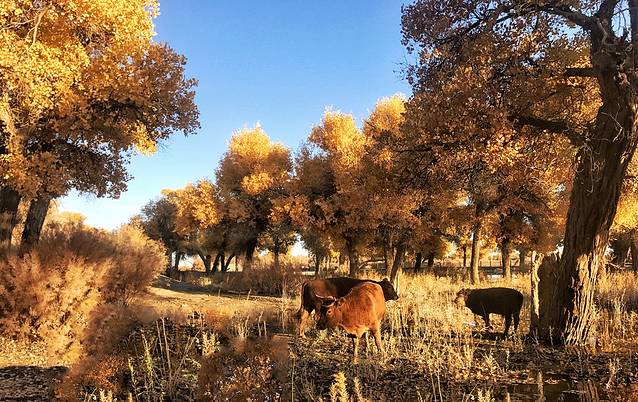深秋时节,金黄的胡杨林在在阳光的照射下呈现绚丽夺目的色彩,成为沙漠深处的一抹亮色。
