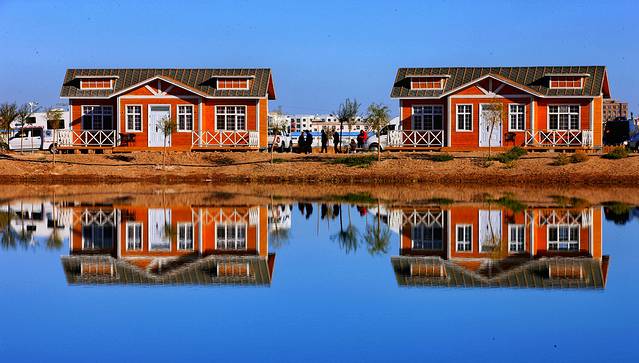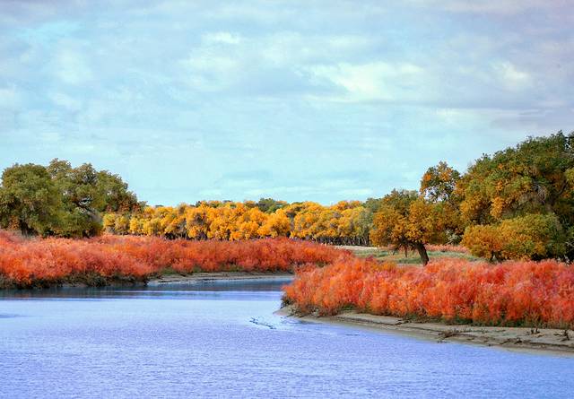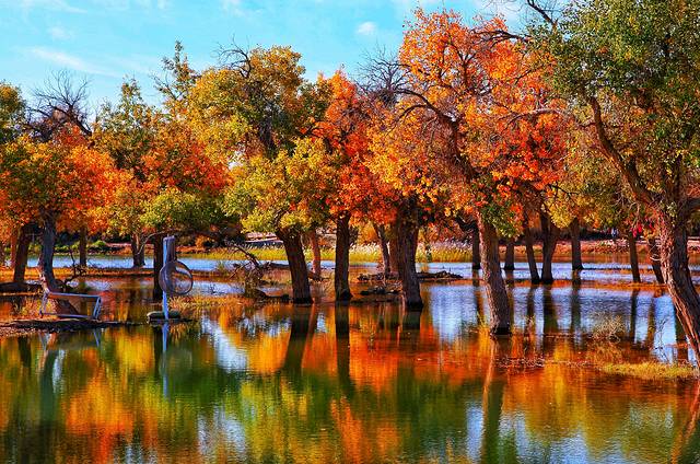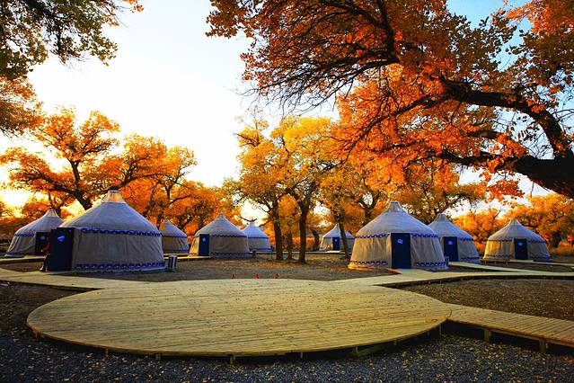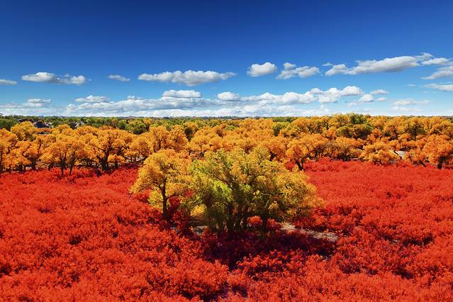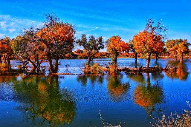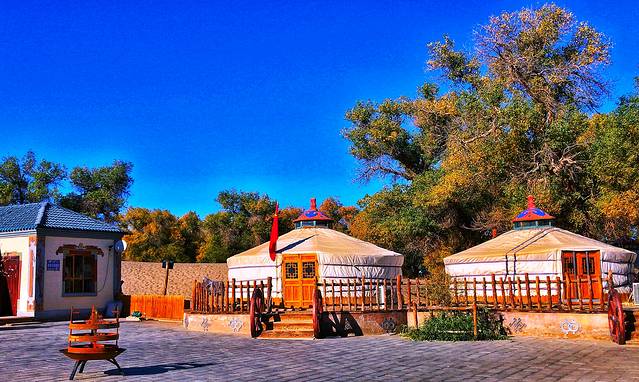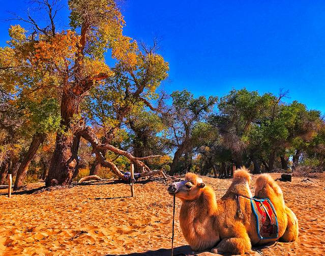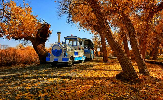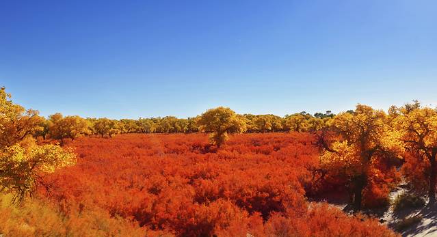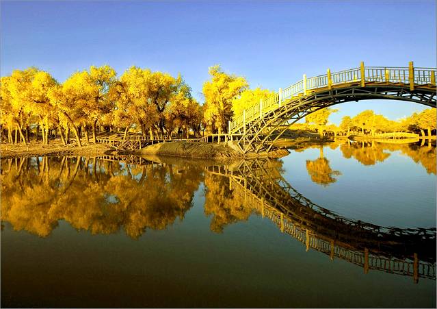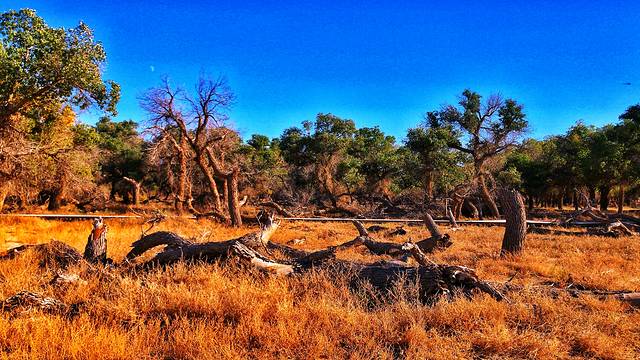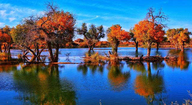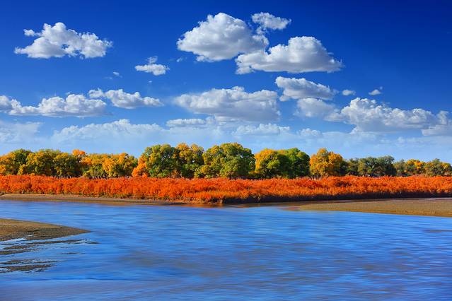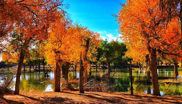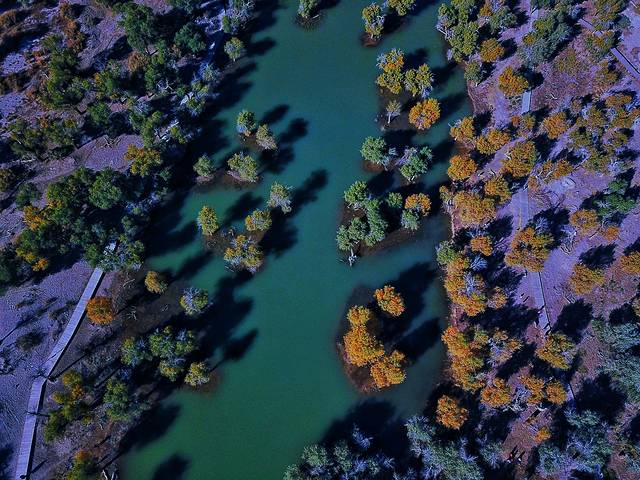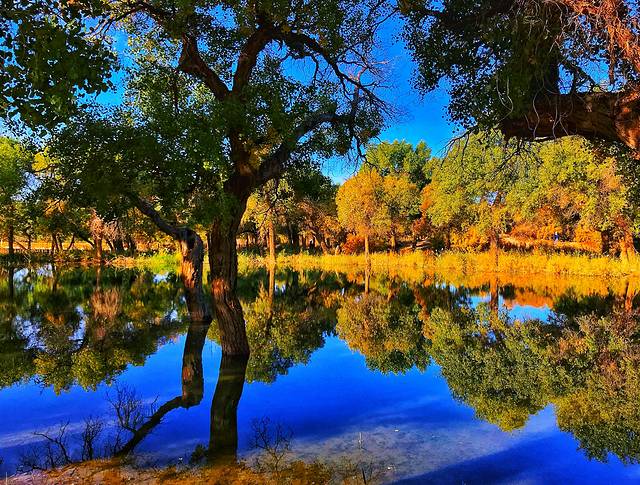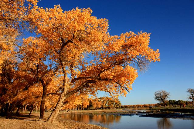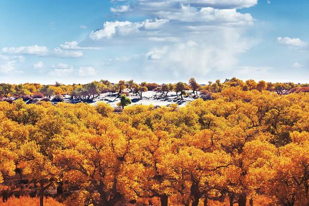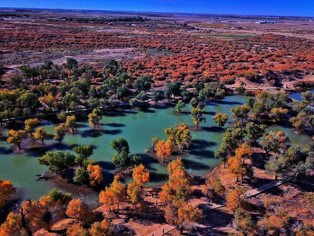 每年的秋天,当萧瑟的风从巴丹吉林沙漠的旷野中吹来,额济纳的胡杨便渐渐沾染上金黄,映衬着蓝天和湖泊,勾勒出一个色彩斑斓的童话世界。