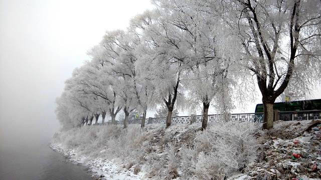 吉林跟柳州十分相像,依山傍水,一条松花江围绕整个吉林市,松花江源于长白山,如一条绿色飘带横贯吉林。松花江两侧的岸堤,是观赏雾凇的好地方。吉林雾凇与桂林山水、云南石林、长江三峡统称为中国四大自然奇观。“忽如一夜春风来,千树万树梨花开”——松花江边每到寒冬,不冻的江水中升腾的水雾遇冷,便会在树上凝结成洁白晶莹的霜花,远处看就如同玉树琼花,恍如进入童话世界一般,美不胜收。