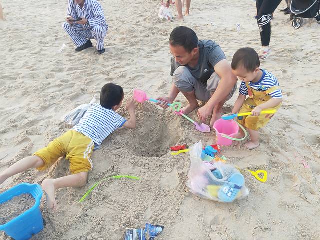 我后来总结,孩子们只要是在沙滩上,只要有铲铲和桶子,他们自己就会玩的很开心,大人也可以轻松一会看看海。老公很好,一直陪孩子玩沙子。