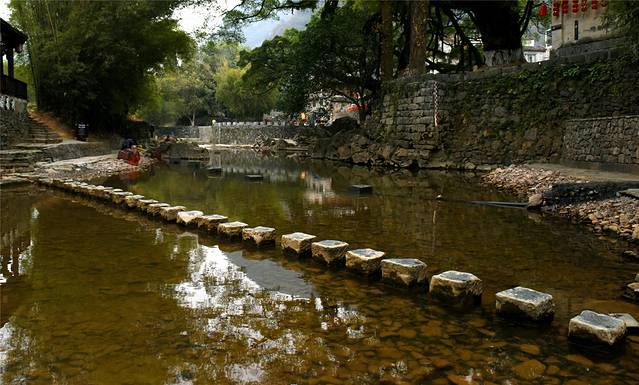 在古镇正门的入口处,有一座造型很特别的桥,那就是石跳桥。这座桥建于清朝嘉靖16年(1811年),距今有200多年的历史。在蜿蜒清澈的溪流上,31个长宽相同的正方形青石成梳状排列,斜跨在溪流上。石墩大半露出水面,每个石墩之间隔着一定距离。由于年代久远,石墩的四周都是青苔。