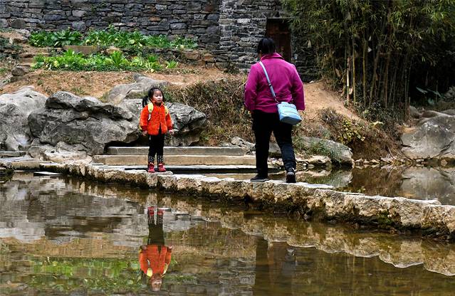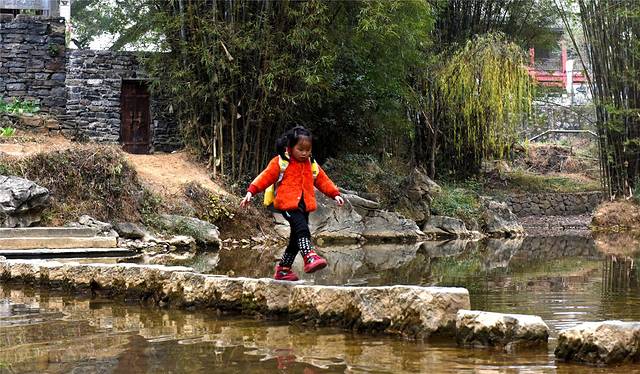 一个漂亮可爱的小姑娘因石墩的距离过宽,过不了桥,着急的喊妈妈,妈妈返回将小女孩抱起,过了那个石墩。之后,小女孩跳跃着一步步跳过石桥。那可爱的样子,让往来的游人都停下来笑着看着她。是不是都想到了童年时期的自己呢?
