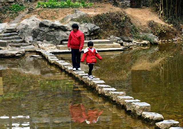 从有着500年以上历史的龙抓榕树下,踏着青石阶梯来到石跳桥。看着一个个古朴的石墩甚是可爱。踏上石墩,才发现,行人走过必须跨越,小孩则和个头矮小的成人则要跳跃了,这无意中增添了许多童趣。