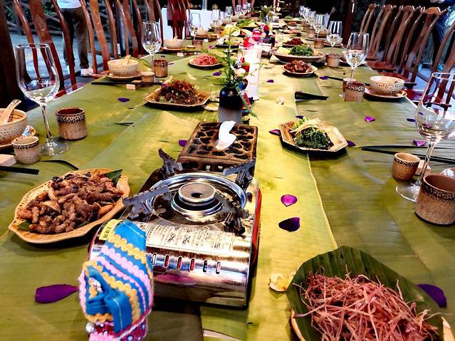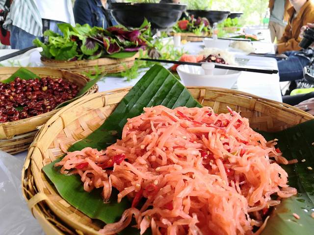 哈尼长桌宴,每一道菜都非常有讲究,每一道菜的食材都非常生态,譬如舂干巴、凉拌树皮、炸蜂蛹等,都是哈尼人民精心制作,传递着哈尼民族的满满祝福,席间哈尼小伙子小姑娘还为我们唱歌跳舞,让吃饭这件事也变得如此生动有趣,舌尖曼妙不由自主地舞蹈着。
