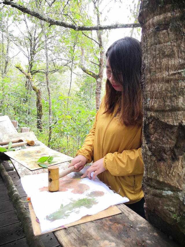 走近雨林深处,当地植物专家带着我们认识许多雨林植被,这些植被有的有毒、有的是药、有的采摘几片叶子立马咀嚼,能消炎清凉等,辨认好花卉植物后,便随手采摘了一些山茶花、野菊等花卉和肥厚的树叶,然后在白布上摆出自己喜欢的造型,用木槌使劲敲打便能染出各种五颜六色的颜色和图案,这便是植物砸染的绝妙之处,晾干后便是世间最美的艺术。雨林秘境的山间,长满各种无法叫出名的菌类,生物多样性以及包容性,让大自然更和谐。