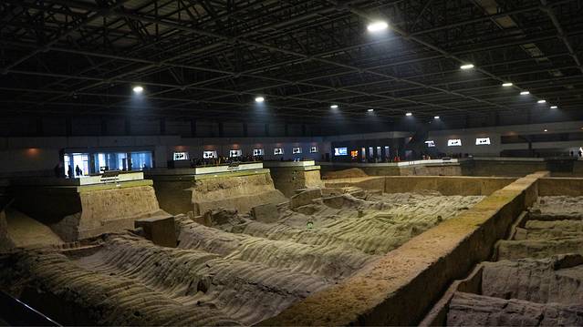 秦始皇兵马俑博物馆共有一、二、三号3个兵马俑坑。一号坑是一个以战车和步兵相间的主力军阵,
