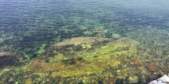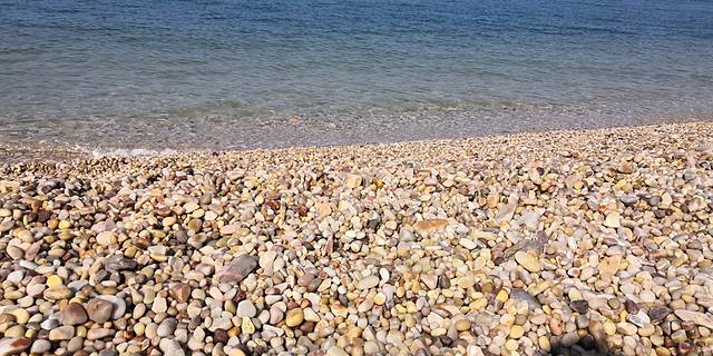 月牙湾的海滩不是沙子,而是天然的鹅卵石, 被海浪冲刷得非常光滑。从各种不同颜色和形状的“宝石”中寻找心爱的,是孩童梦,也是我们现在梦, 赤脚踩在上面,被冰凉的海水一冲,一股沁凉加上少少的脚底麻意,非常有趣。