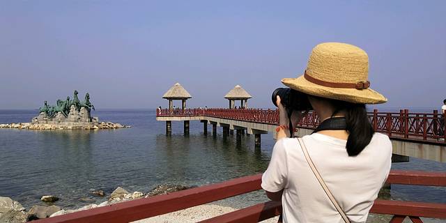 主要景点在西北海岸,紧邻渤海,同大连在地图上隔海相望。我是第一次骑电动小摩托, 一路追赶着老婆的小摩托,一路上碰到观景台,就停车看风景, 经过海蚀洞,金蟾石,日月台,妈祖像,秦风崖等,或拍照, 或看海,阳光明媚,十月的风带着凉意。
