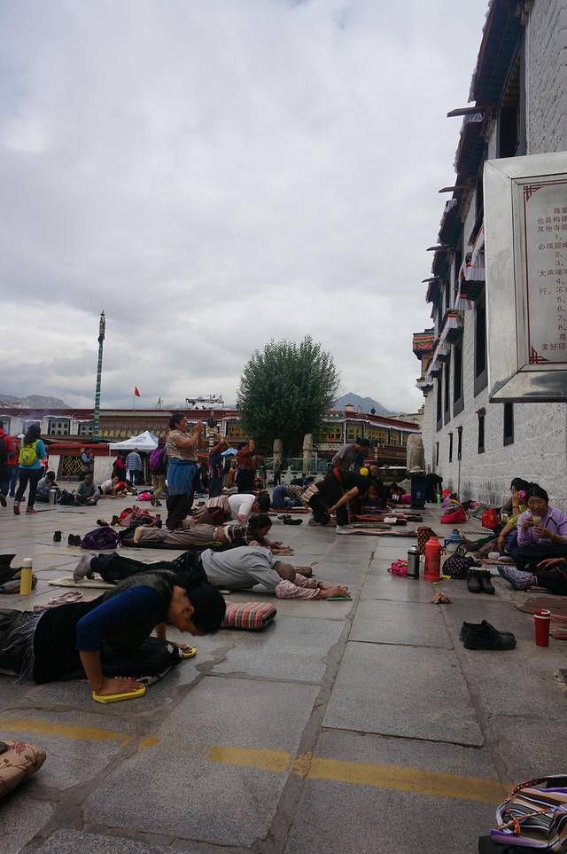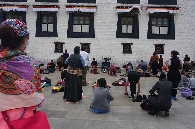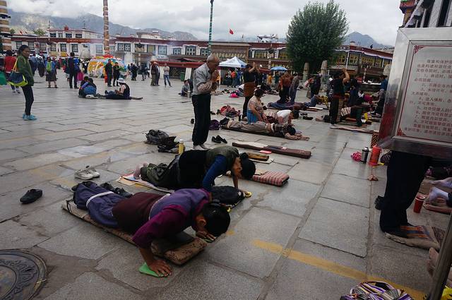 做礼拜的藏民每天都会来做功课,藏传佛教徒修法密宗,顶礼自然是少不了的必备功课和功德,虔诚的佛教徒至少要修满十万个顶礼,而这只是入门级别的功课而已。