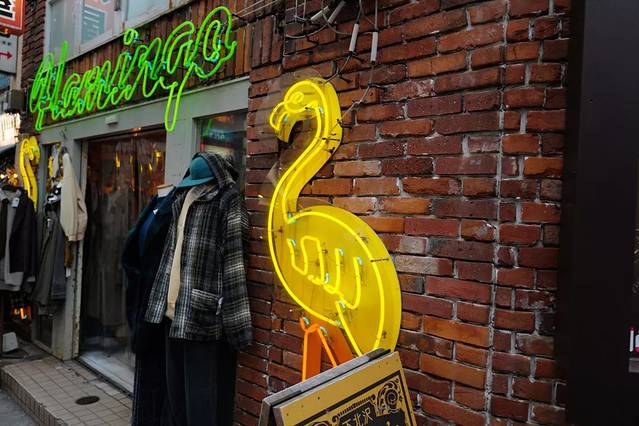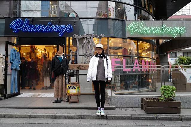 门口偌大的霓虹灯拼成的火烈鸟特别显眼,不用刻意去寻找,总会逛得到,FLAMINGO在下北泽有好几家分店,是这里比较有名气的一家古着连锁店,也非常受日本大学生欢迎。