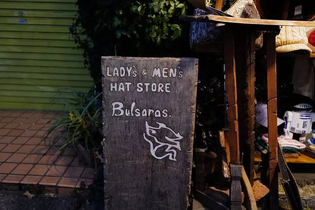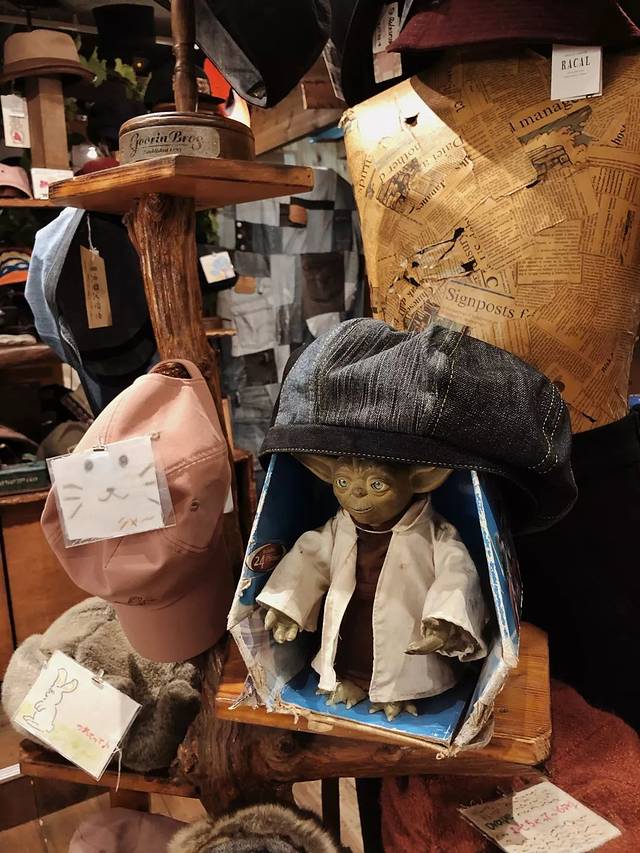 我们就这样在挤满帽子的屋子里边看边聊,最里面有一对美式乡村酒吧的镂空木门,等我们经过这里的时候店主突然冒出半个身子和我们打了个招呼,笑眯眯地教我如何调节我手里的那顶帽子,他大概也把自己当成蘑菇屋里的精灵了吧。
