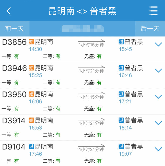 昆明到普者黑的车次非常多,平均每个小时就有一班