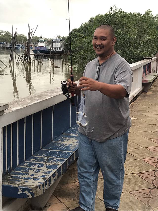 早餐后就闲着走走,看到这个马来小哥在河边正在钓鱼。