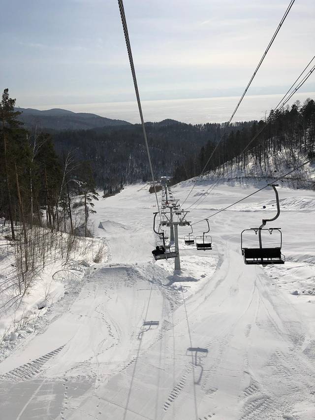 因为是周末,雪场挺多local家庭来玩儿的。买了缆车票后,搭缆车上山。这种缆车是全敞的,挺刺激的。一路上山周边风景很好,下山时更佳,正对着远方的安加拉河。就想一直这样坐下去,不要到站。