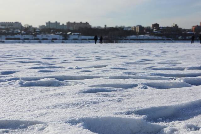 陆地和奥岛的连接处,本是湖水,冬季已结好了厚厚的冰面,行车是没问题的。车子第一次开上冰面的时候,不由得提心吊胆,生怕这冰面裂了怎么办。