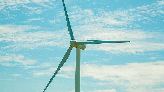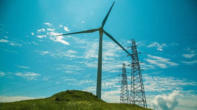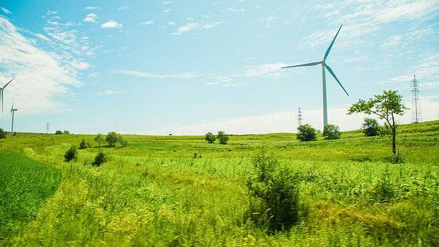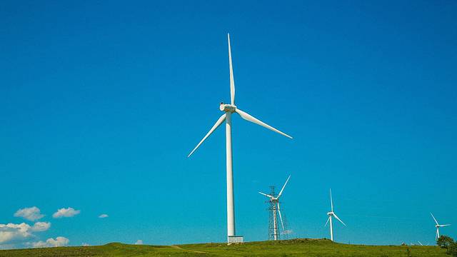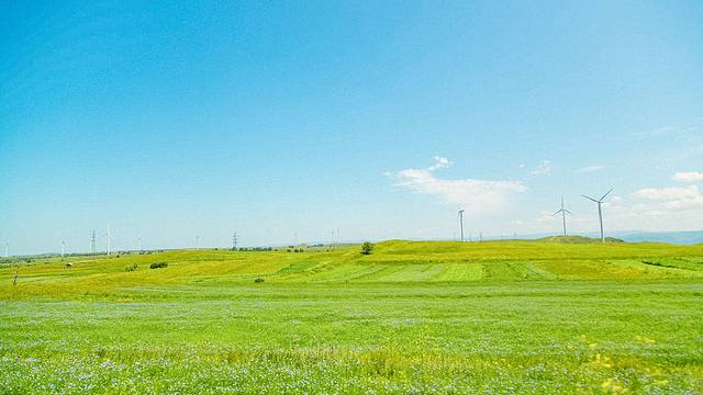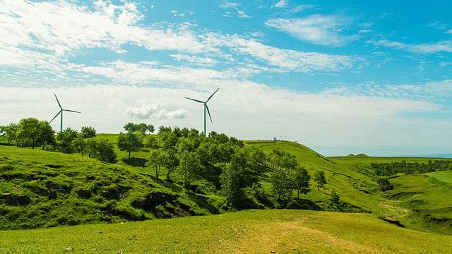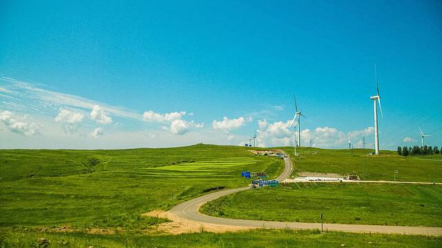 巨大的风力发电机组,矗立在高高的山岗上。衬着蓝天。白 云和 绿色的草原也是一种美丽的风景
