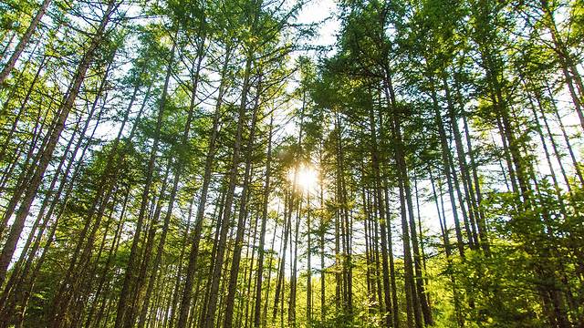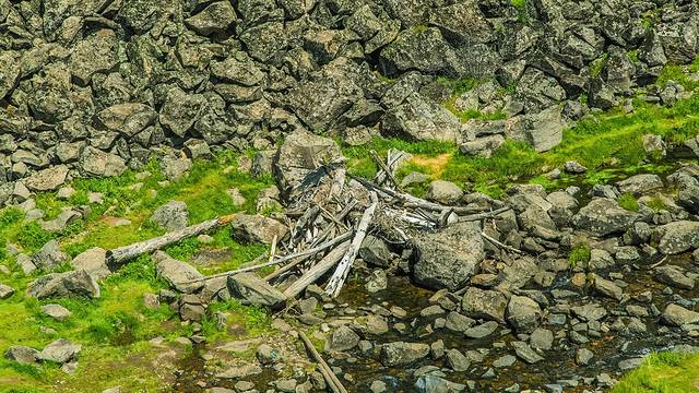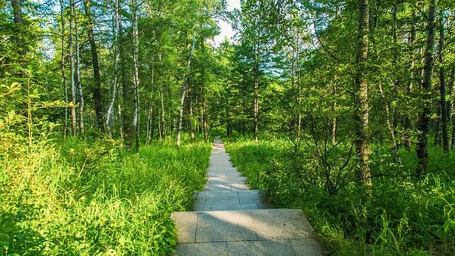 不过即便土壤稀薄,这里也并非只有黑褐色的火山石。熔岩缝隙中还长满了偃松和苔藓、蕨类,就连高大的落叶松也在岩石间挺立着。因此也有人说秋季的石塘林最迷人,黑色的熔岩、金黄的树叶和晴朗的蓝天,彰显着层次分明的美。