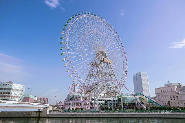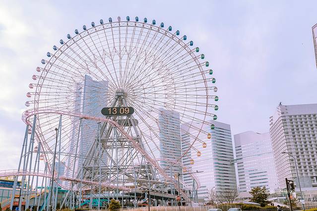 这座cosmo world摩天轮高达112.5米、直径100m、总载客量达480人,是未來港21地区地标性的存在,也是世界上最大的时钟式摩天轮,搭乘摩天轮,除了让我们感受 横滨 悠闲浪漫的气息外,更是能全方位的俯瞰 横滨 港的美景和整个太空世界,视角相当的震撼。