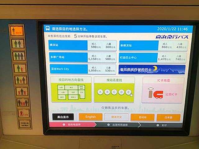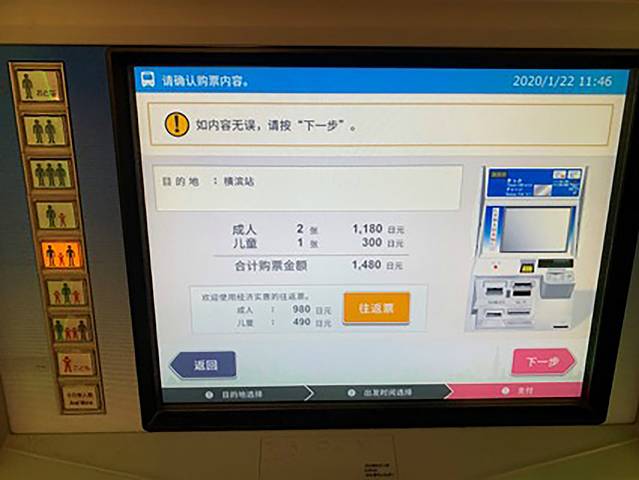 自助机有中文选项,界面很友好,按着提示一步步操作,很轻松就能买到票了。没上中学的孩子都可买儿童票,到 横滨 成人590日元,儿童300日元。