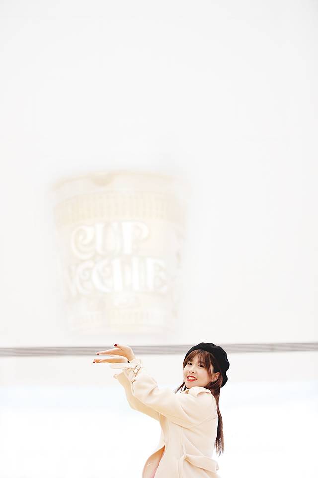你再回头看,在出入口的正上方,还有一个光影效果打造的大型花灯日清杯,通过视觉借位的效果,来,请你吃杯面啦~