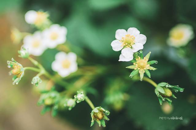 草莓洁白的花瓣上,还沾着新鲜的露水,娇艳欲滴。