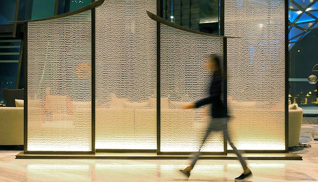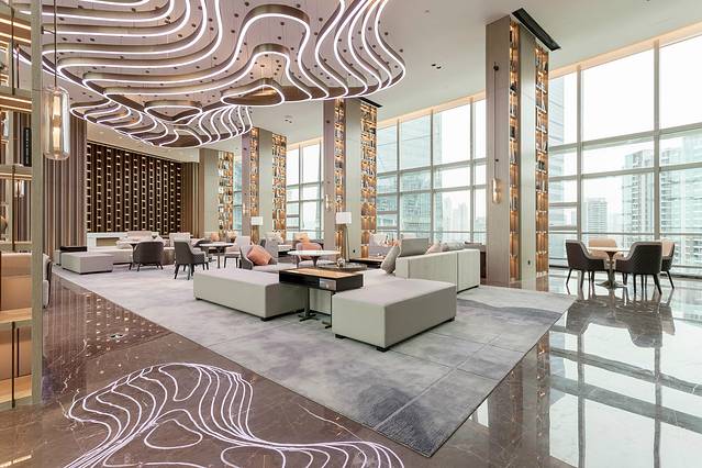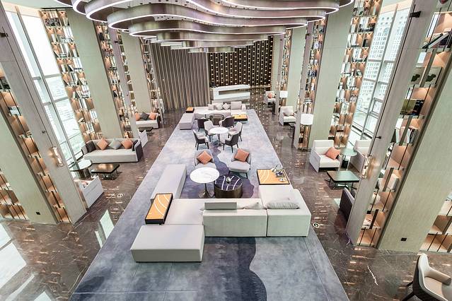 三楼逸廊·行政酒廊尽致了都市感,酒柜与桌椅倒映在大理石地板上,窗外耸立的高楼冲击着视觉,这一切隐约散发着未来时代的气息