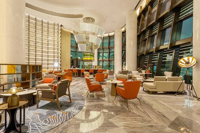 整个潮·大堂空间宽敞明亮,暖色系设计也经过考究,形成一种柔和的色彩学